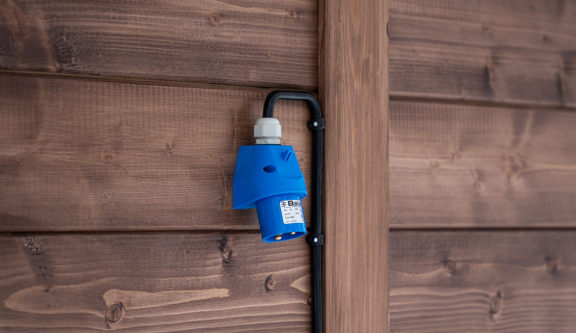 Saunassa on sähköistys valmiina. Seinässä on normaali valovirtapistoke 10A sulakkeella.